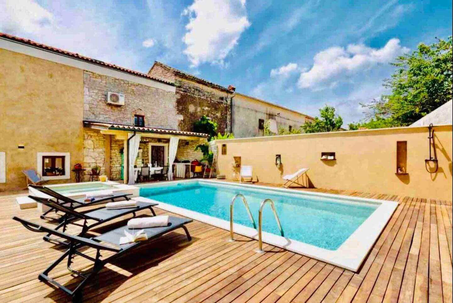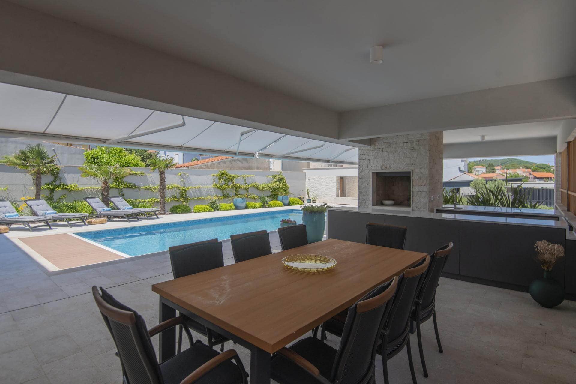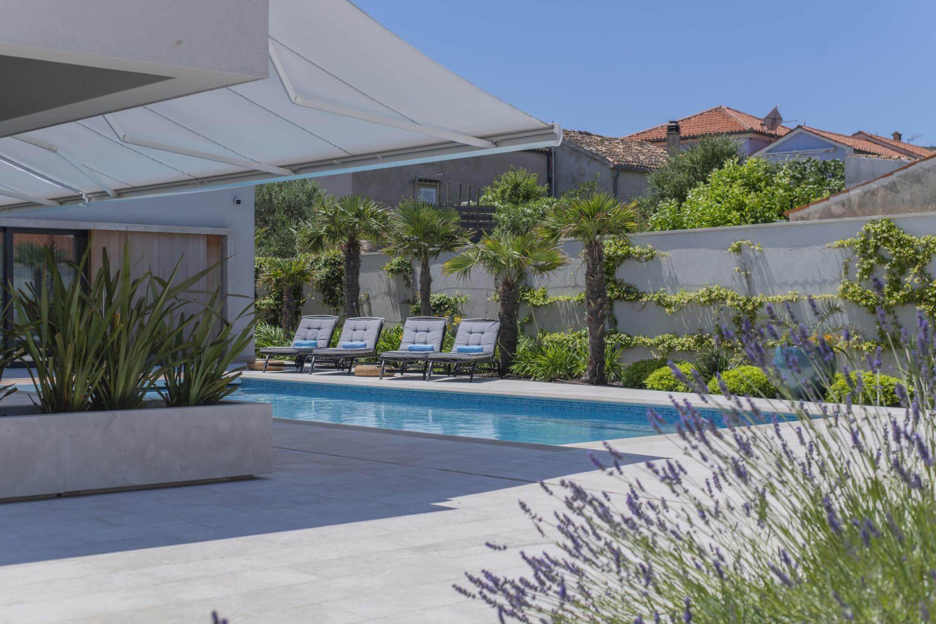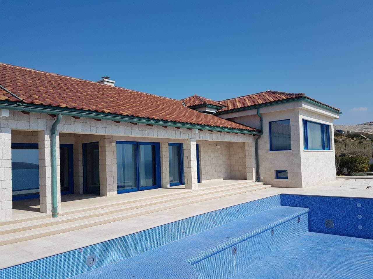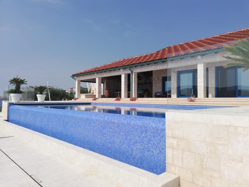 The coping stone for swimming pools is made and designed according to the customer’s measurements and preferences, using granite, marble, or limestone. A hammered or burnt finish is recommended for slip-resistant surfaces.